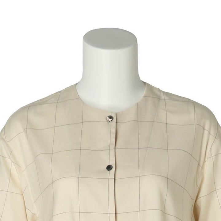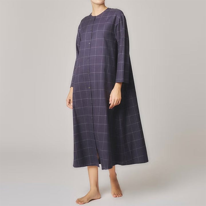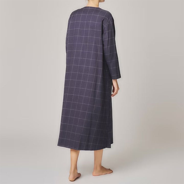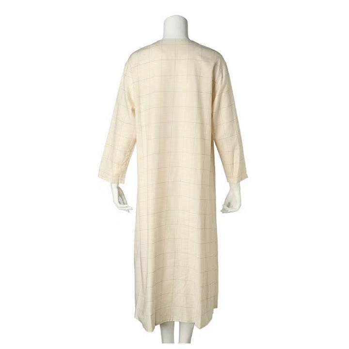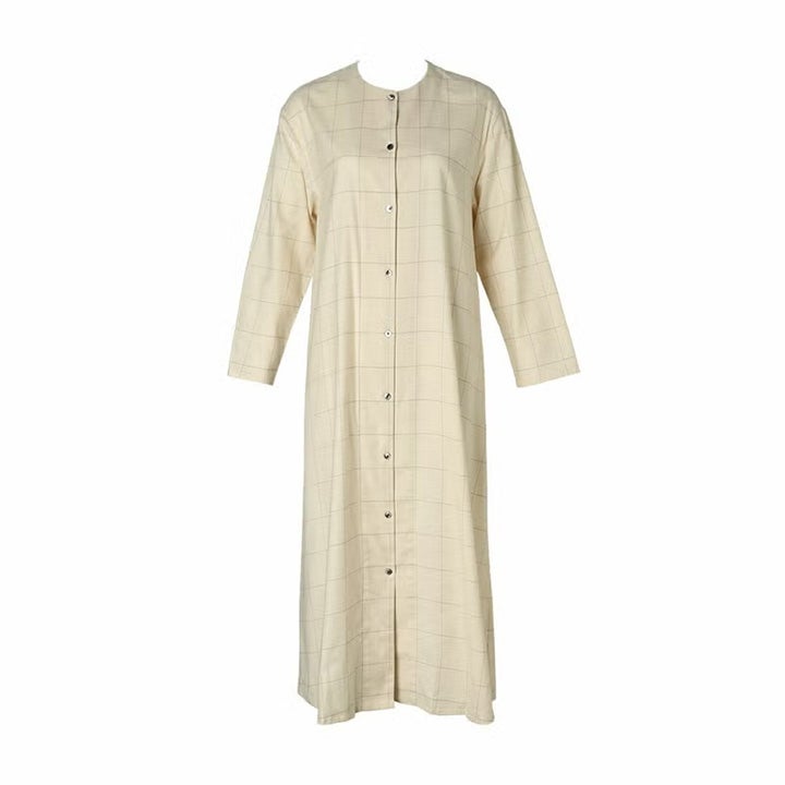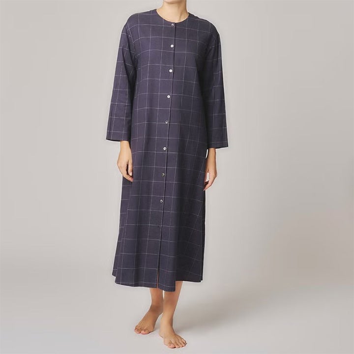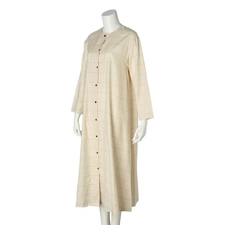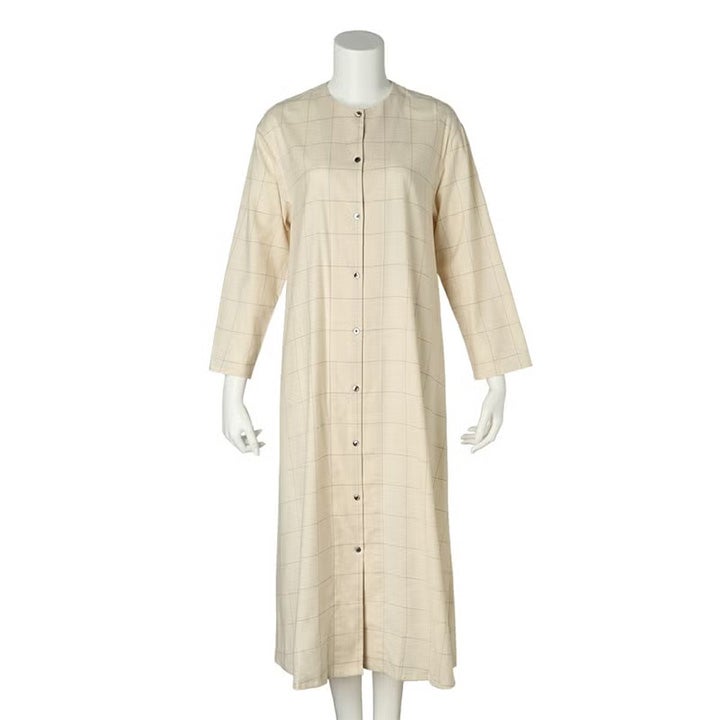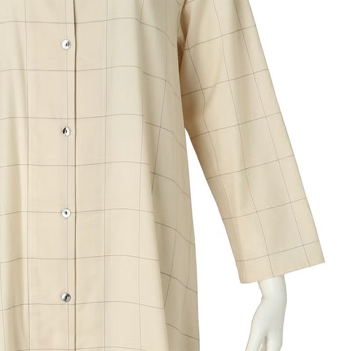 コットン&ウール ツイルの ウインドペン は軽やかで温かい。 1920年代のカフェ・ギャルソンのユニフォームをイメージしたラウンジウエア。 クルーネックのシャツワンピース。前開きは黒蝶貝釦。 寒い季節に羽織としてもサラっと着用出来る様、袖口・裾のヘムを細めに軽やかに仕立てた。