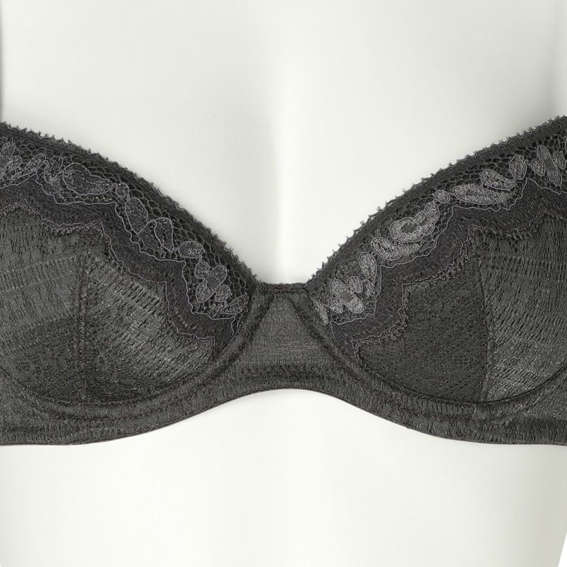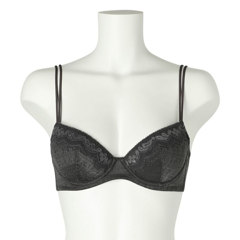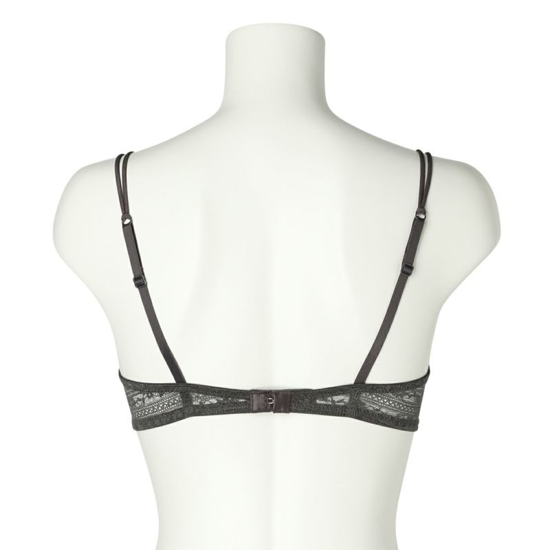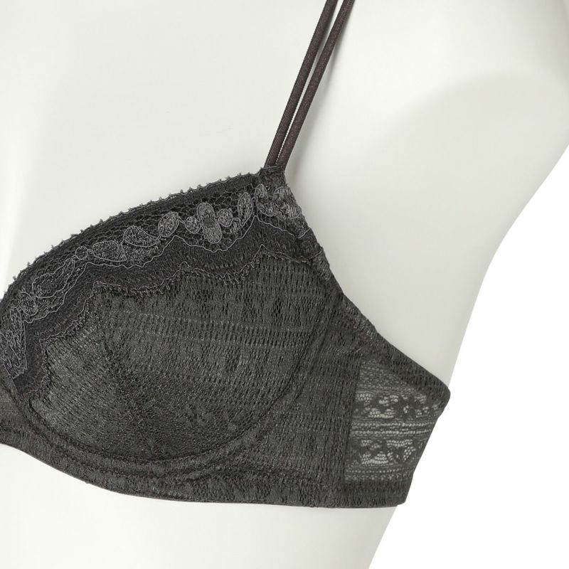 フランス製のリバーレースをカップ上辺に重ねアクセントに。ストラップはループタイプで軽やかさを演出。