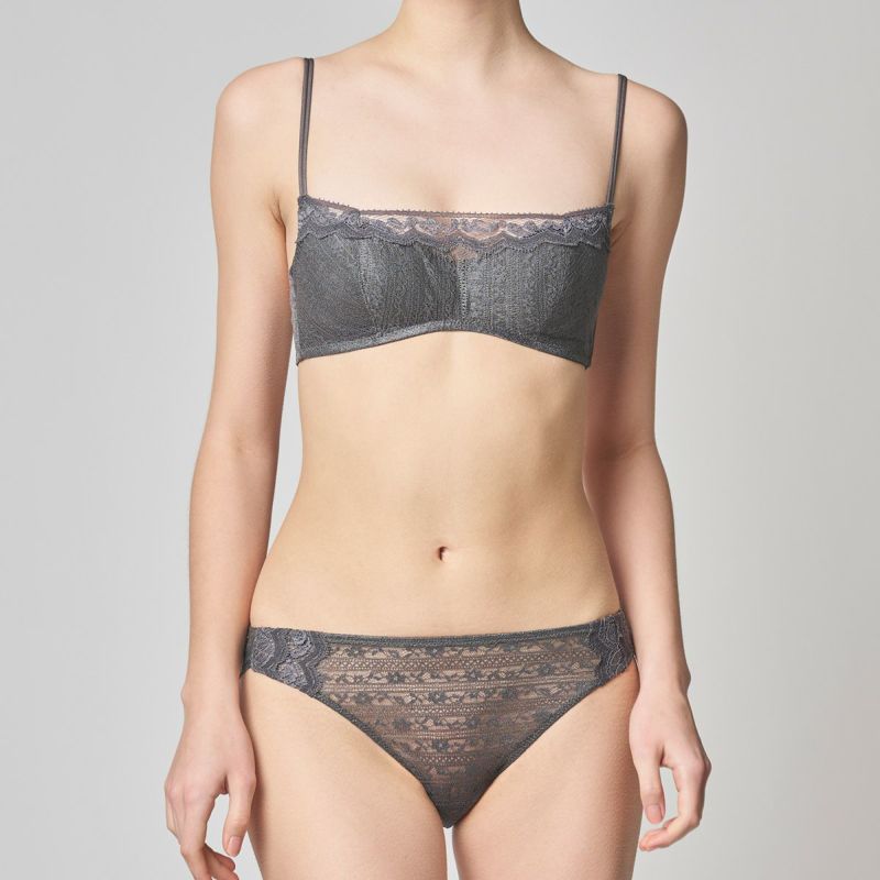 モンパルナスで最も歴史あるブラッスリー ”ドーム” をイメージし、直線で構成したオールオーバーレースと植物柄のリバーレースをセレクト。 ドームの店装の特徴でもある、アールデコとアールヌーボーのミックススタイルを表現したコレクション。 レースからさりげなく覗く素肌が映える総レースのスタンダードショーツ。 前身頃の脇にフランス製のリバーレースを2列に配しアクセントに。 後身頃の足口はゴムを使用ぜず、オールオーバーレースを折り返しフラットに仕立てた。