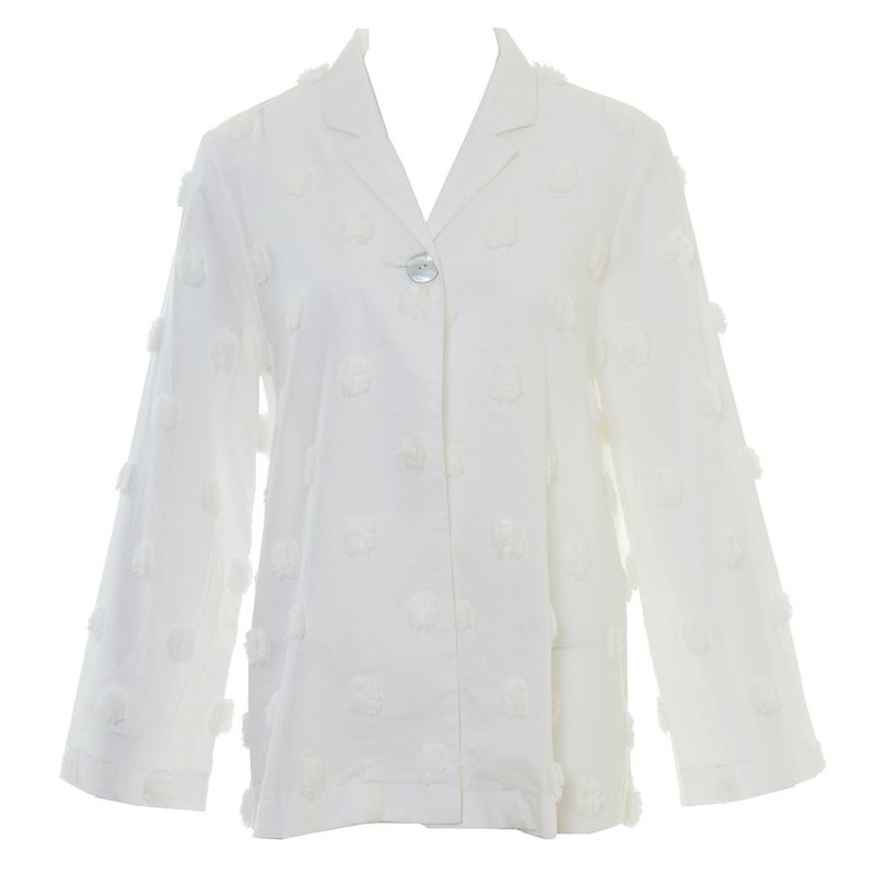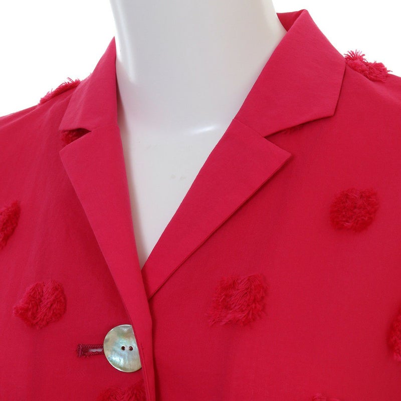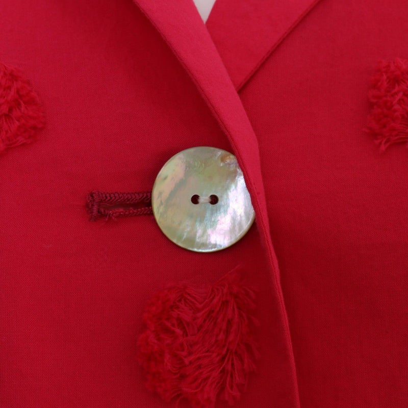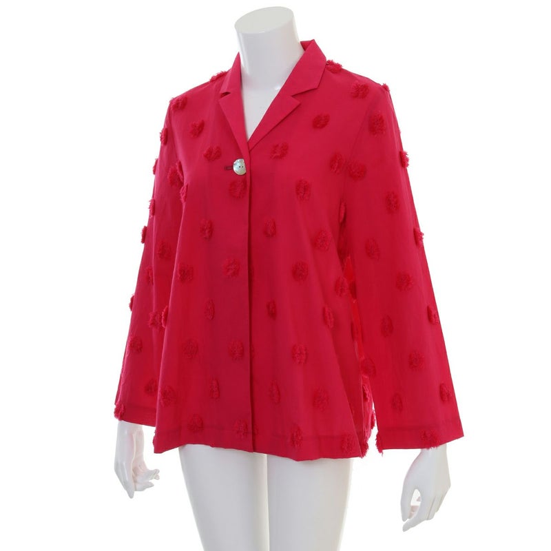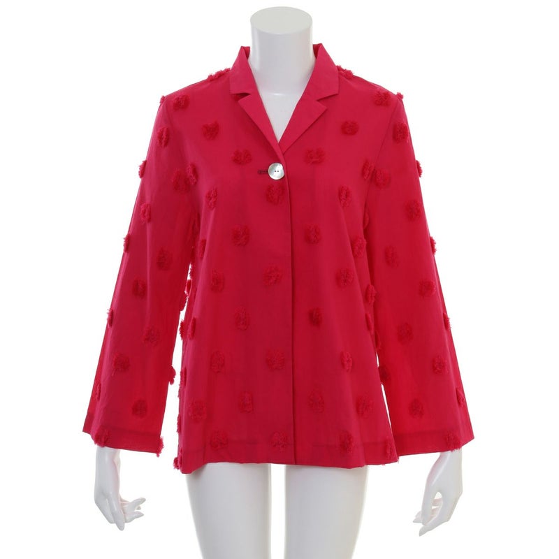 立体感のあるフリンジドットが目を引くセラードシリーズから、ジャケットが登場。前中心の大きな貝ボタンがアクセント。これからの季節の羽織りにぴったりです。