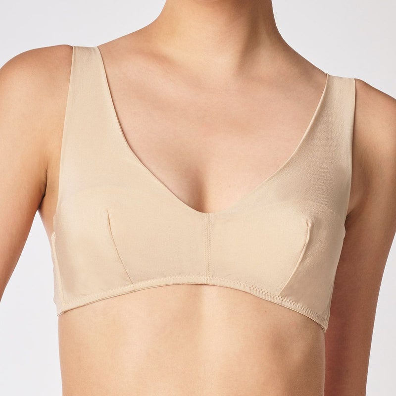 " 纏うヌード " シルク素材のさっぱりとした質感と軽やかな着心地が魅力のベーシックライン。 肌に触れる素材から快適な一日を過ごしてほしいという想いを込めたアイテムのラインナップ。 薄手のパットが内臓されたハーフトップブラ。 胸元から肩にまでつながるパターンが 優しく胸を包み込むような着用感。 カップの肌側にまで全面シルクを使用し、布地の魅力を存分に感じて頂けるアイテム。