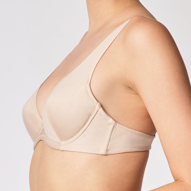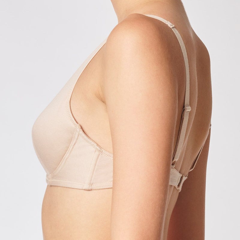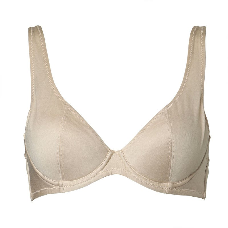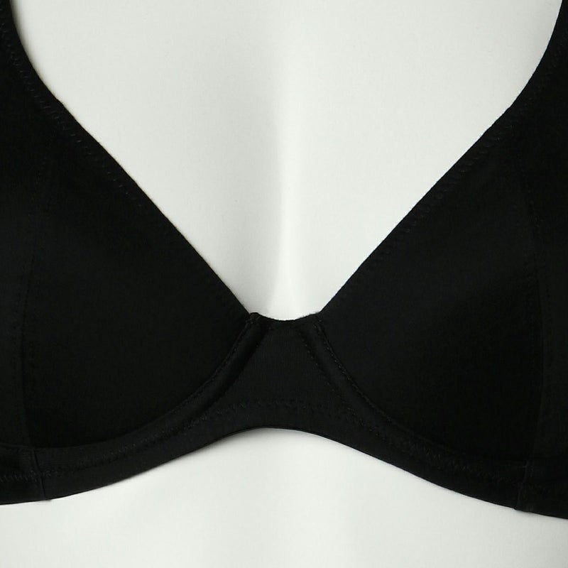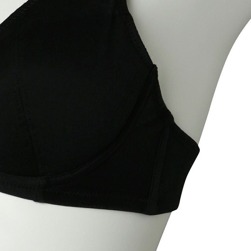 こだわりの細番手オーガニックコットン糸でハイゲージに編まれた天竺ニットは 優美な光沢が美しい。 カップのサイドから肩までひとつづきの構造、バックストラップも太幅で綿混のものを使用。カップ肌側はオーガニックコットン。 クラシカルなシルエット・洗練された素材のコンビネーションで、安定感のある着心地を兼ね備えた逸品。