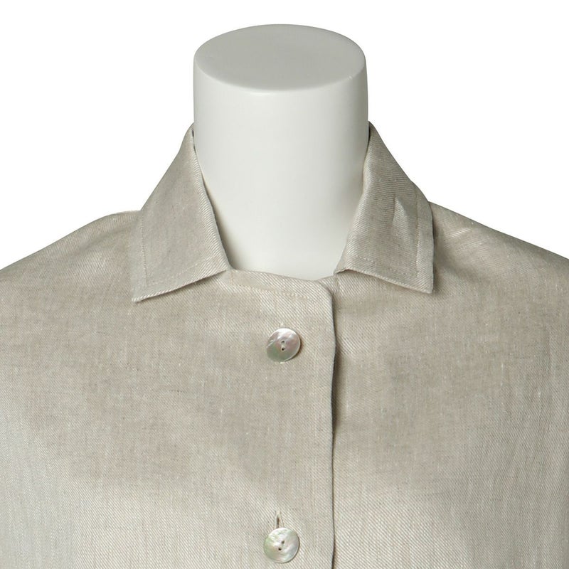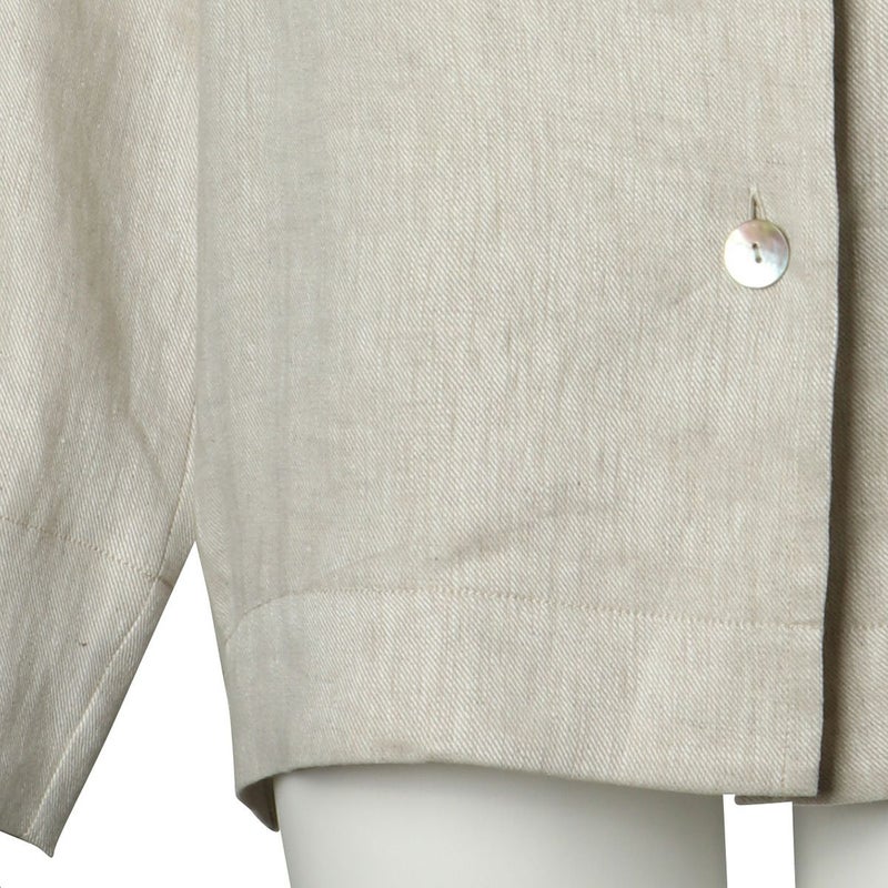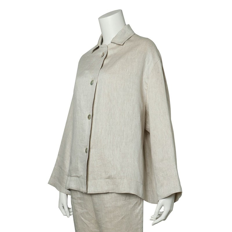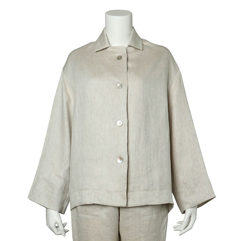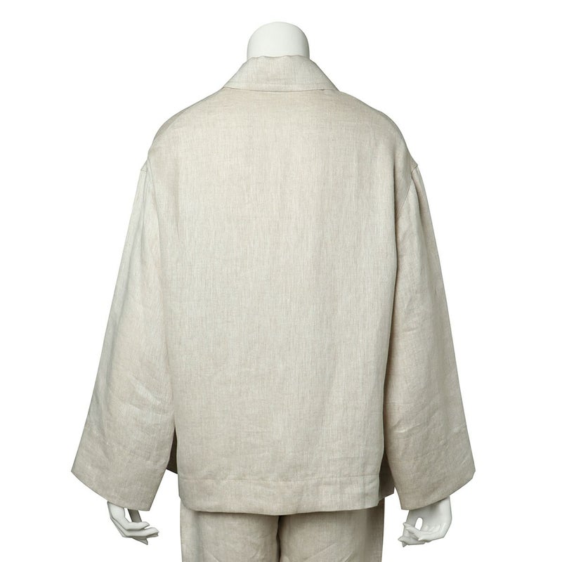 大きめの貝釦の光沢もアクセントに、袖口と裾の広幅の折り返しが布の動きをしなやかに演出する。