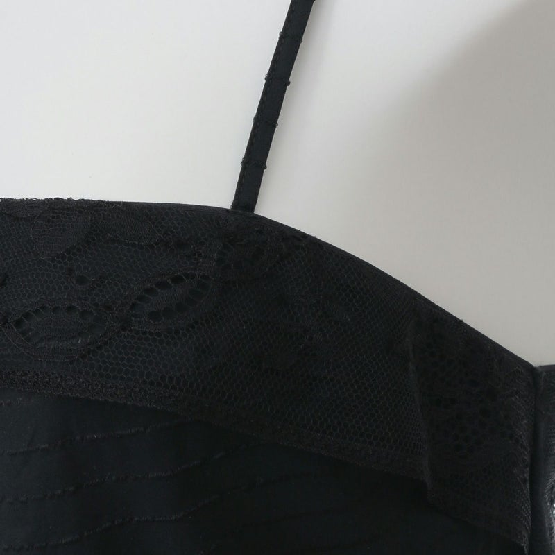 「The water reflection」をテーマに雪降るヴェルサイユの森をイメージしたコレクションをお届けします。ストライプに透かしたイタリア製のストレッチ織物。可憐に咲く冬の花、冬の泉の情景をイメージした繊細でシックな印象のシリーズです。丈60cmのシンプルなキャミソール。身頃上辺のレースがデザインポイント。
