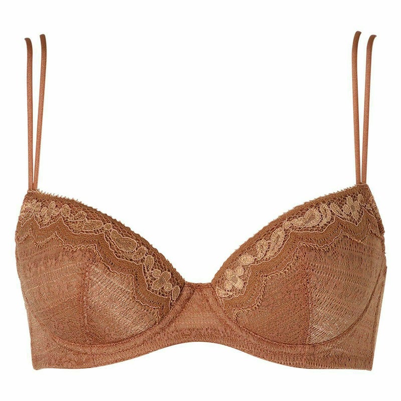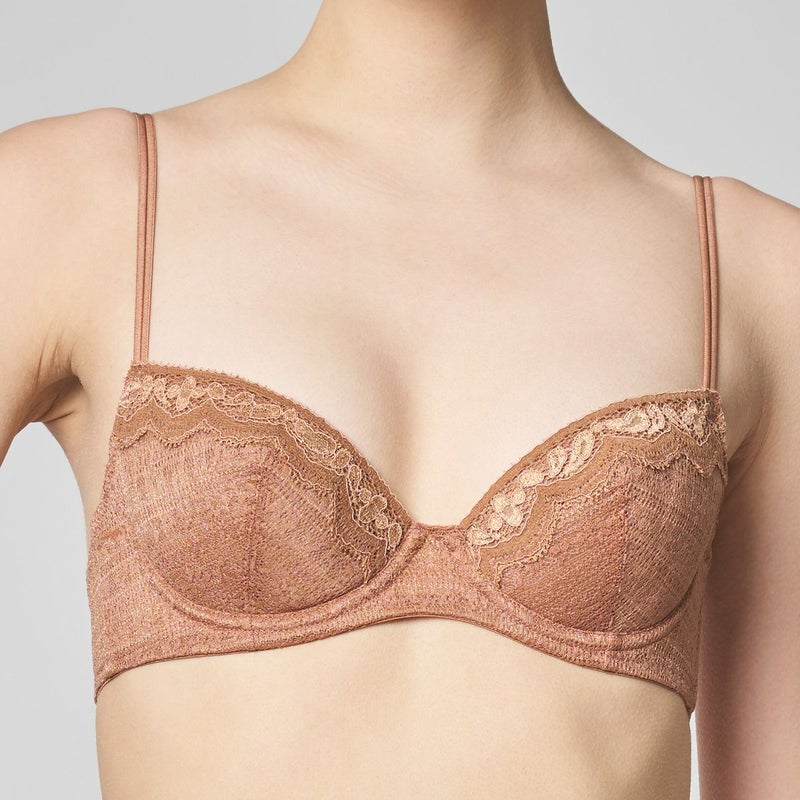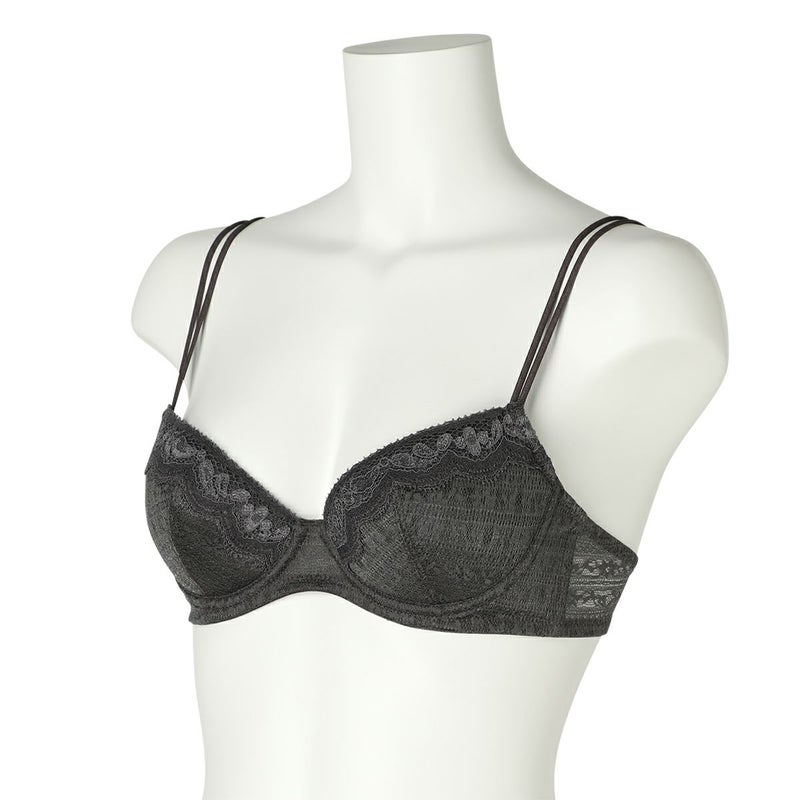 フランス製のリバーレースをカップ上辺に重ねアクセントに。ストラップはループタイプで軽やかさを演出。