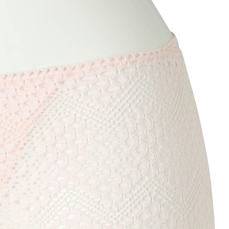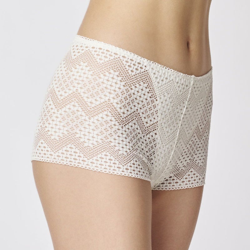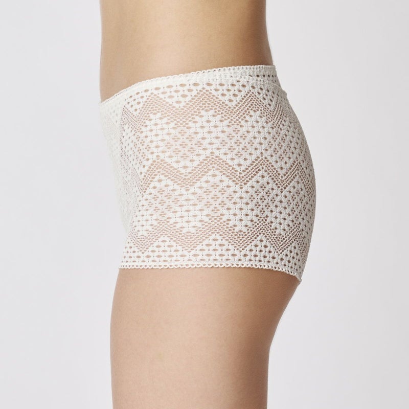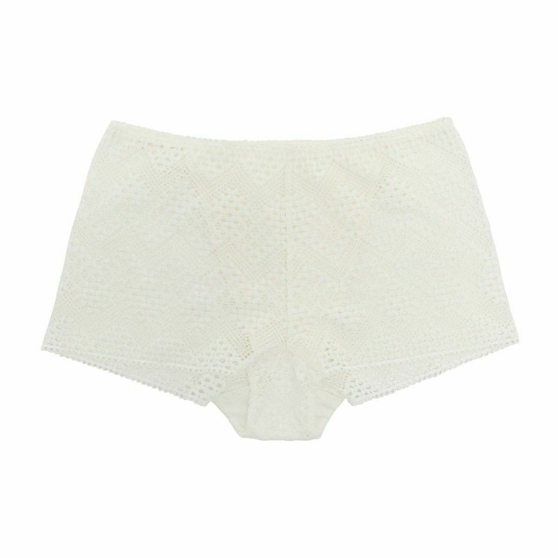 ルーチョ・フォンタナの作品にインスパイアされたコレクション。 -キャンバスに穴を開ける 空間概念- 穴の連なりの様に柄を形成したストレッチレース・ドライタッチな綿×麻天竺の組み合わせ。 履きこみがやや深いヒップハングショーツ。 全面ストレッチレースで足口にゴムを使用せずフラットにボディフィットする。 前身頃の肌側に綿麻天竺、マチ肌側は柔らかな綿天竺使い。