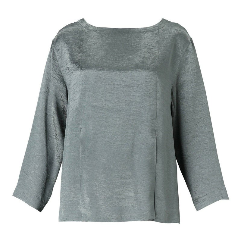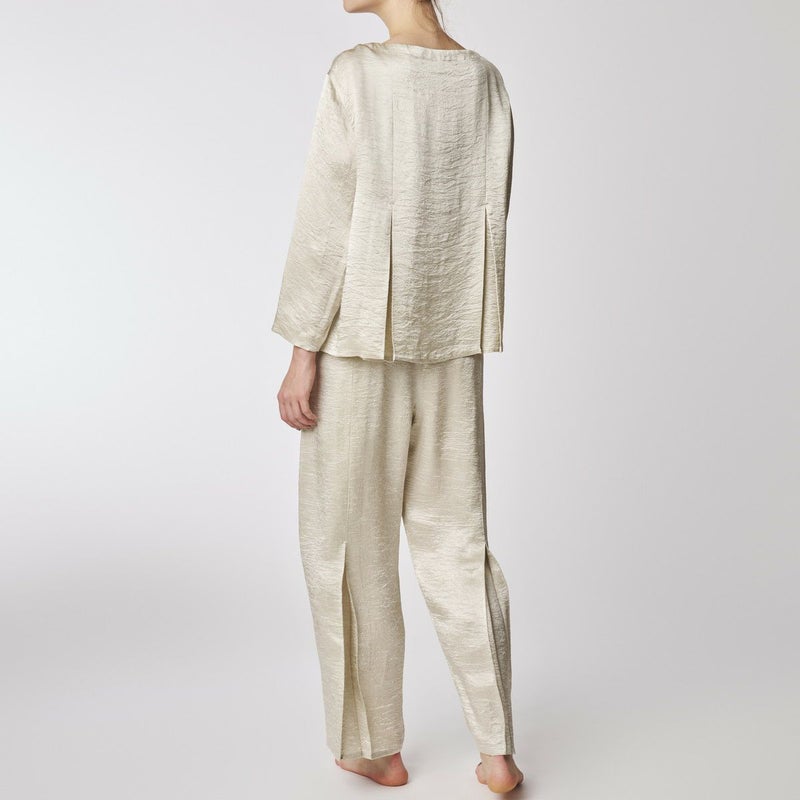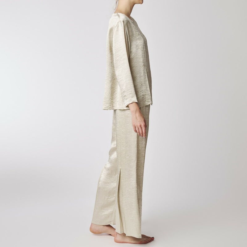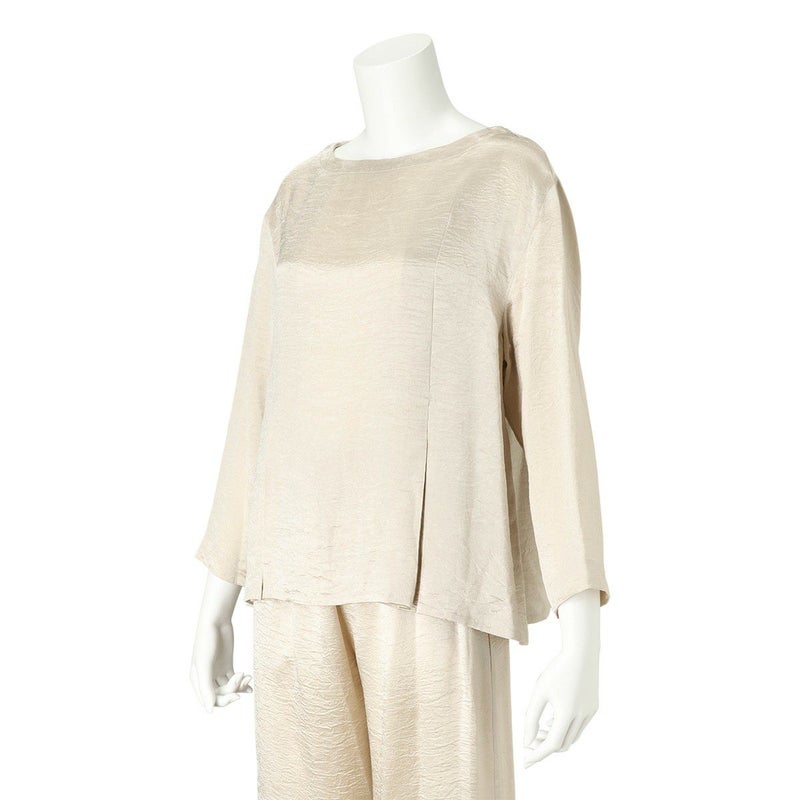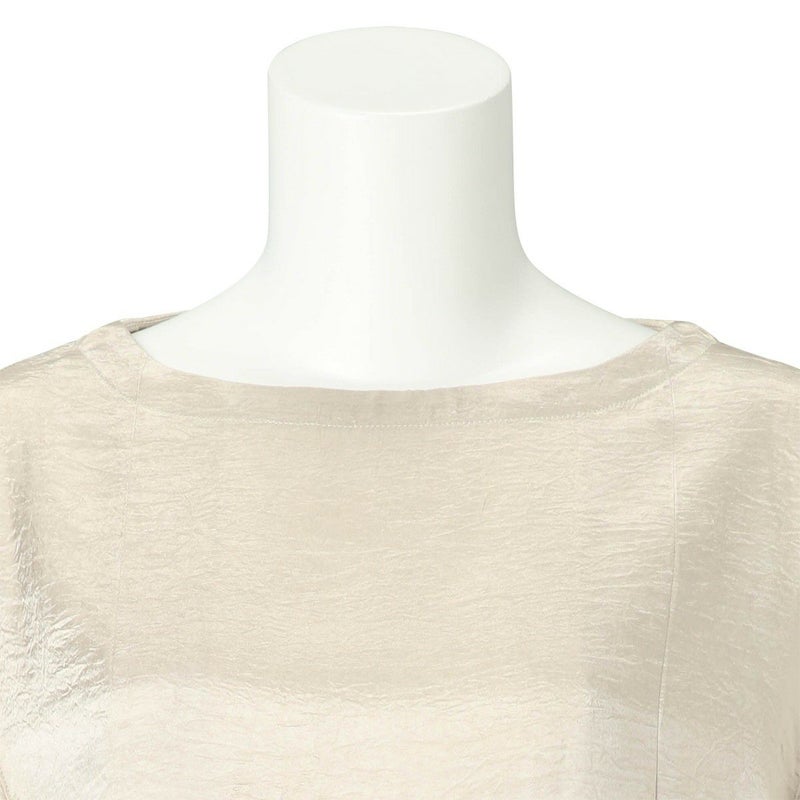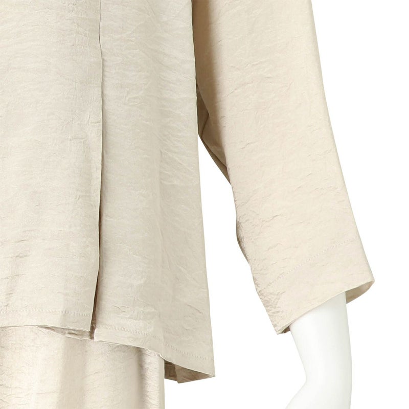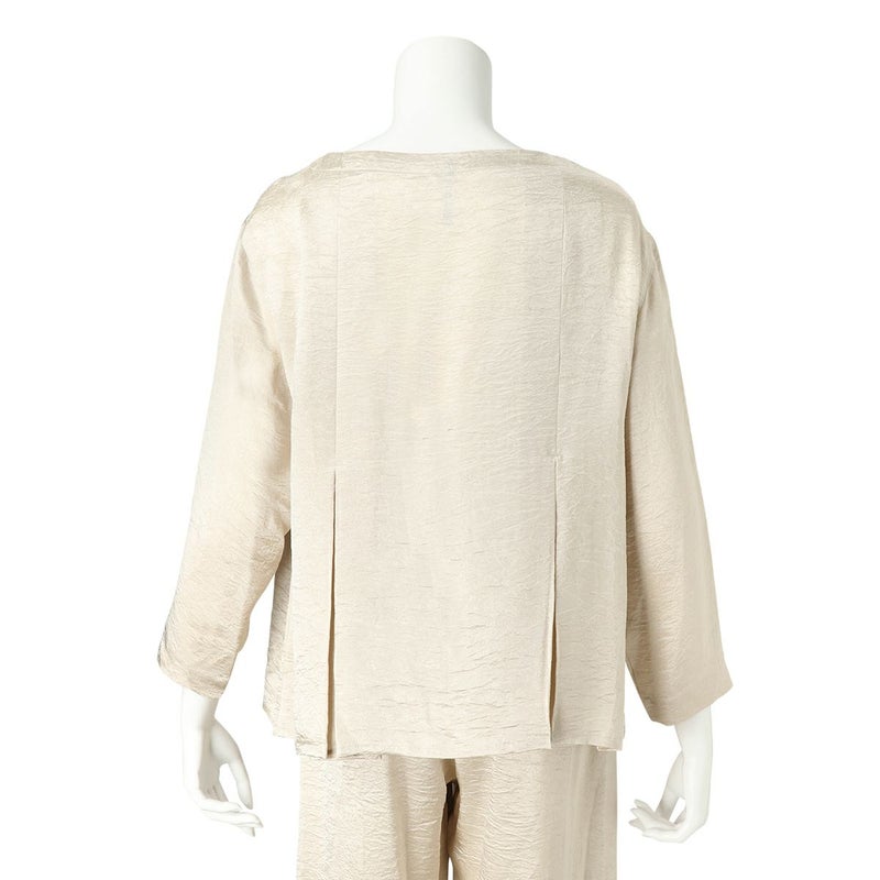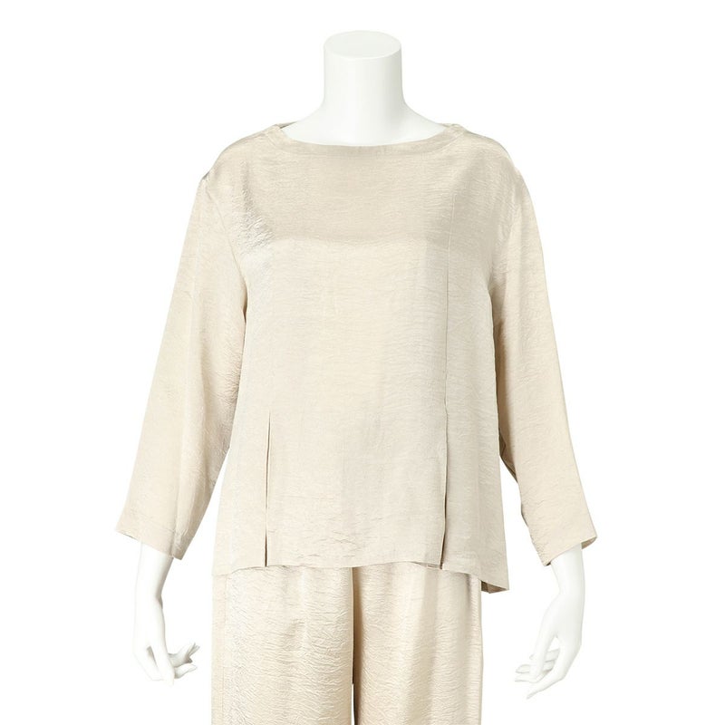 吸水性・速乾性に優れた素材にナチュラルなシワを施したサテン布地。 深く折り込んだボックスプリーツが身頃の動きによってフォルムにアクセントをもたらす。有機的な運動の美学。 前左右・後左右にボックスプリーツを施したボートネックラインのロングスリーブトップス。 滑らかな質感でシワ加工を施した布地は、初めから着馴染んだ様なリラックス感のあるウエア。 身体の動きが生むプリーツの揺らぎ布地の光沢がアクセントに。