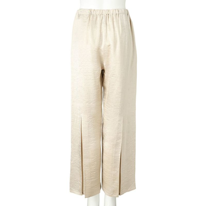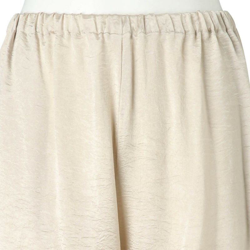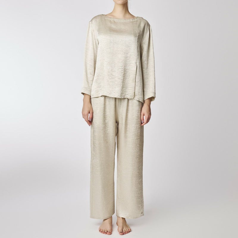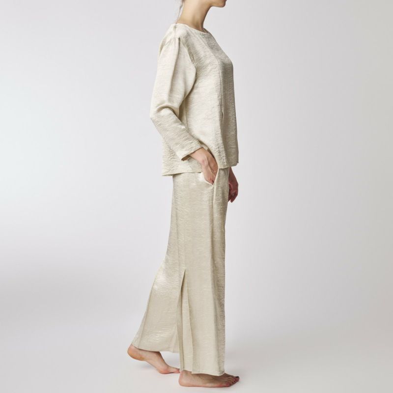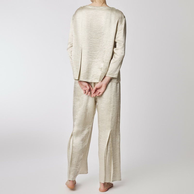吸水性・速乾性に優れた素材にナチュラルなシワを施したサテン布地。 深く折り込んだボックスプリーツが身頃の動きによってフォルムにアクセントをもたらす。有機的な運動の美学。 後身頃、左右の中央にボックスプリーツを施したボトム。 滑らかな質感でシワ加工を施した布地は、初めから着馴染んだ様なリラックス感のあるウエア。 身体の動きが生むプリーツの揺らぎと布地の光沢がアクセントに。