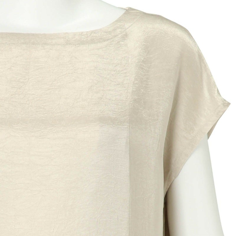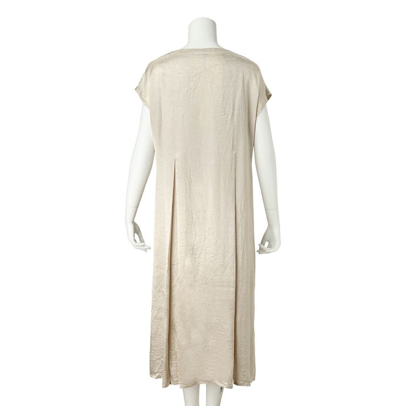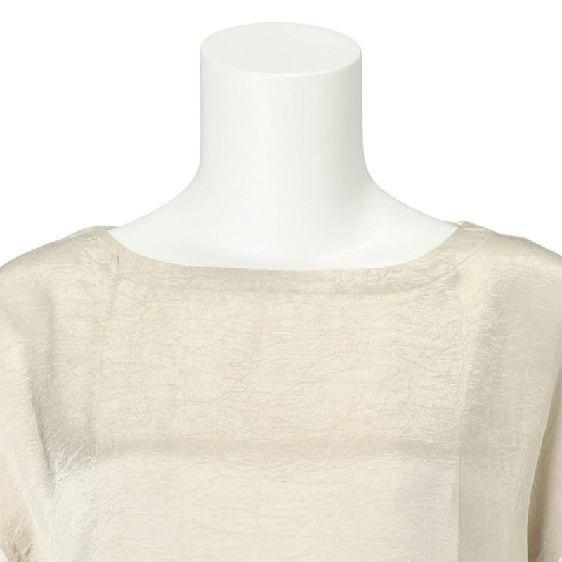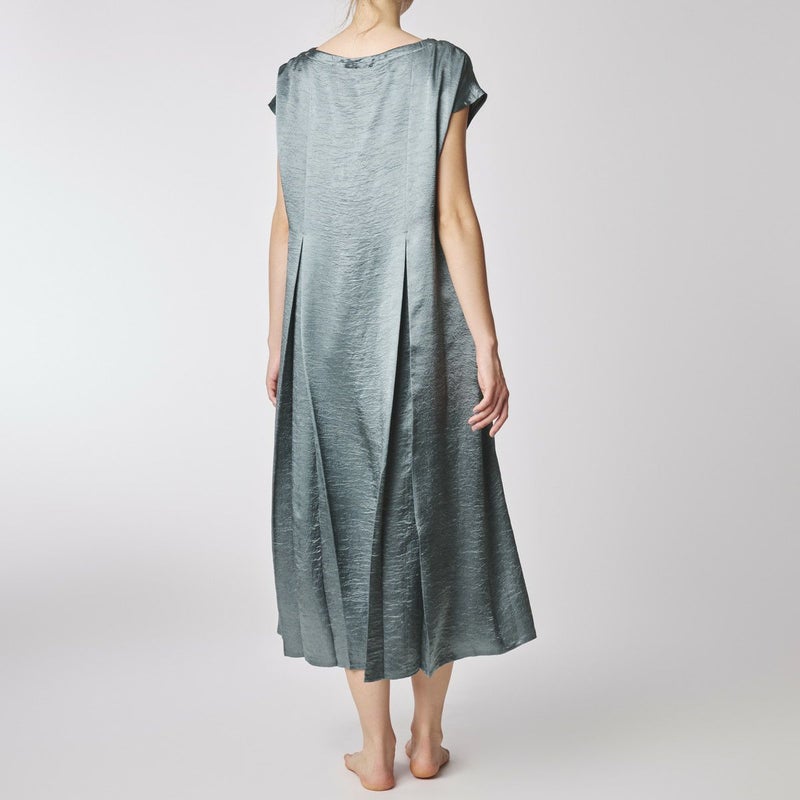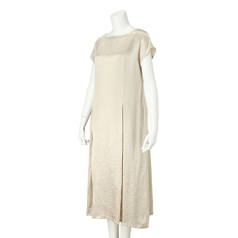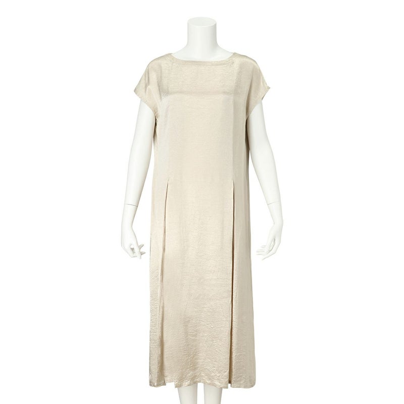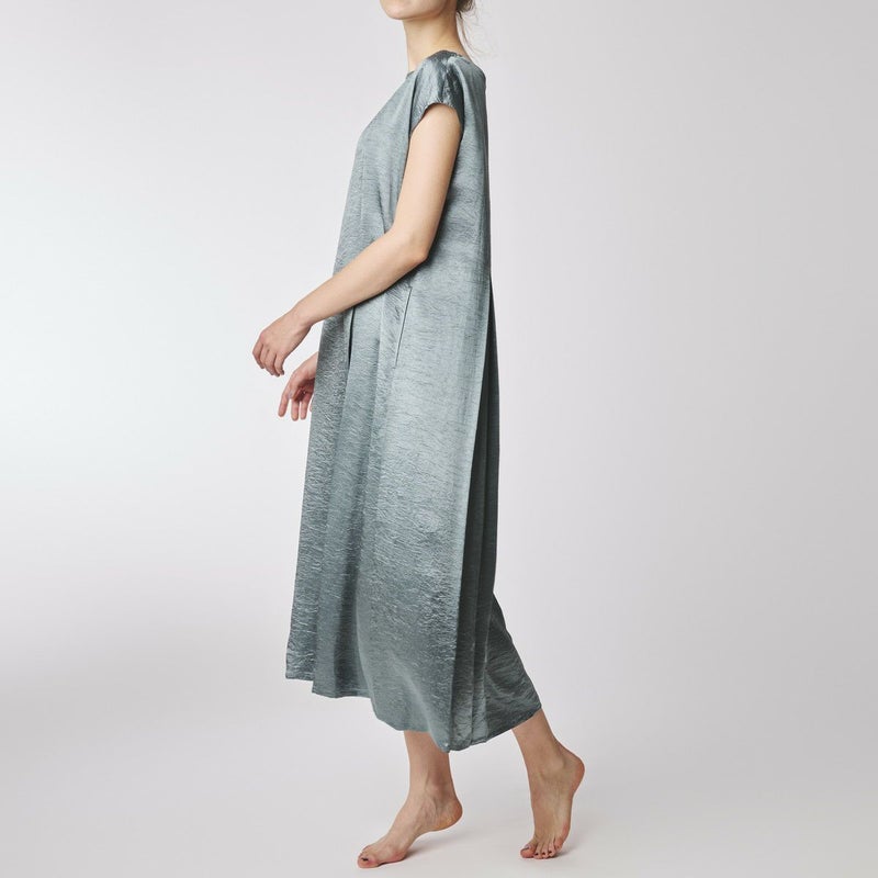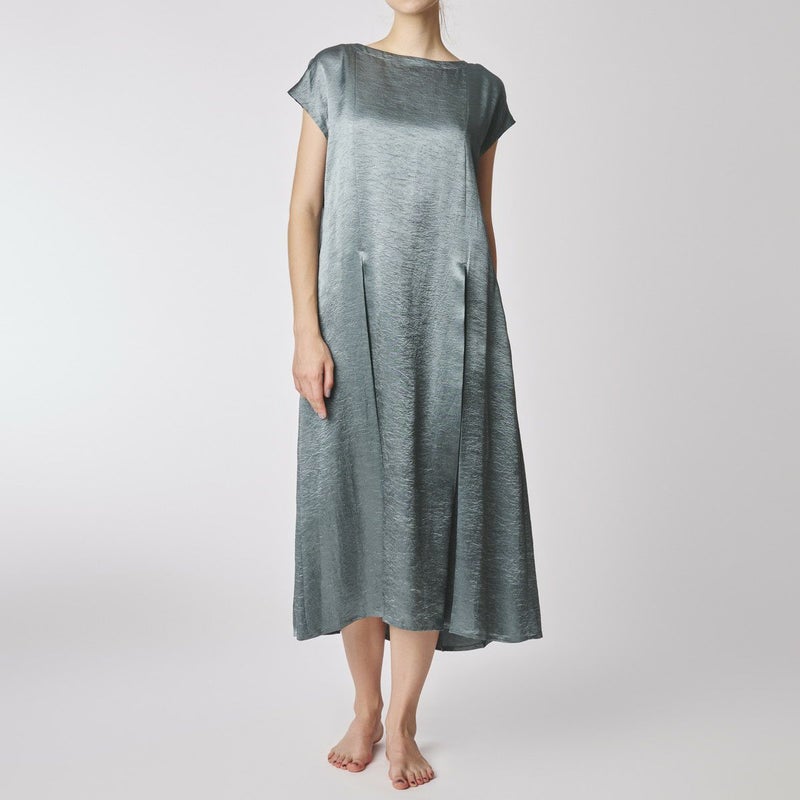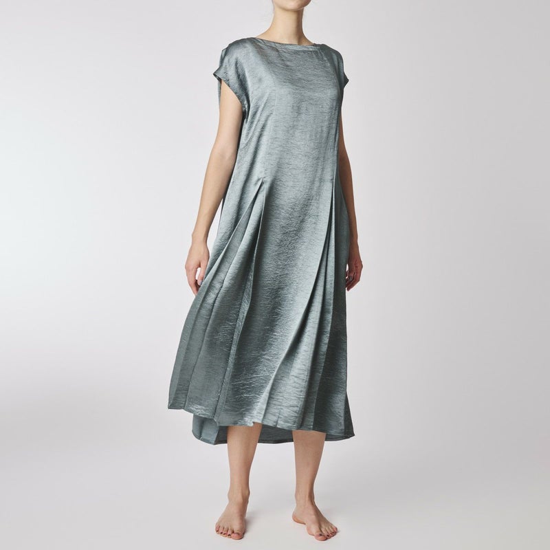 吸水性・速乾性に優れた素材にナチュラルなシワを施したサテン布地。 深く折り込んだボックスプリーツが身頃の動きによってフォルムにアクセントをもたらす。有機的な運動の美学。 前左右・後左右にボックスプリーツを施したボートネックライン・フレンチスリーブのロングワンピース。 滑らかな質感でシワ加工を施した布地は、初めから着馴染んだ様なリラックス感のあるウエア。 身体の動きが生むプリーツの揺らぎ布地の光沢がアクセントに。