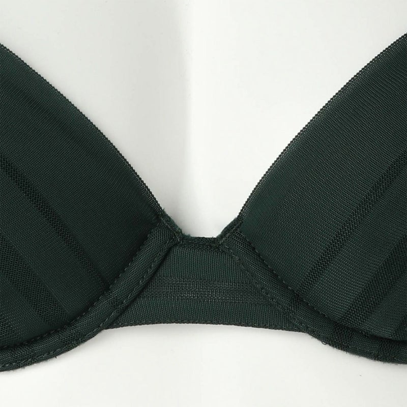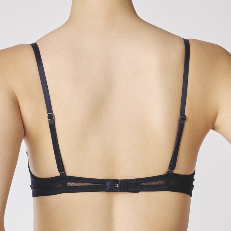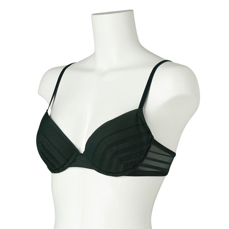 ルーチョ・フォンタナの作品にインスパイアされたコレクション。 - キャンバスを切り裂く- ボーダー柄のストレッチレースはエッジのフラットさを活かし軽やかに仕立てた。 伸縮性のあるウレタンパットがナチュラルにバストフィットするメガネタイプの3/4カップブラ。 カップの肌側は全面綿素材で柔らかな肌当り。 サイドボーン無しでバックスタイルのボーダーレースから覗く肌もスタイリッシュに。