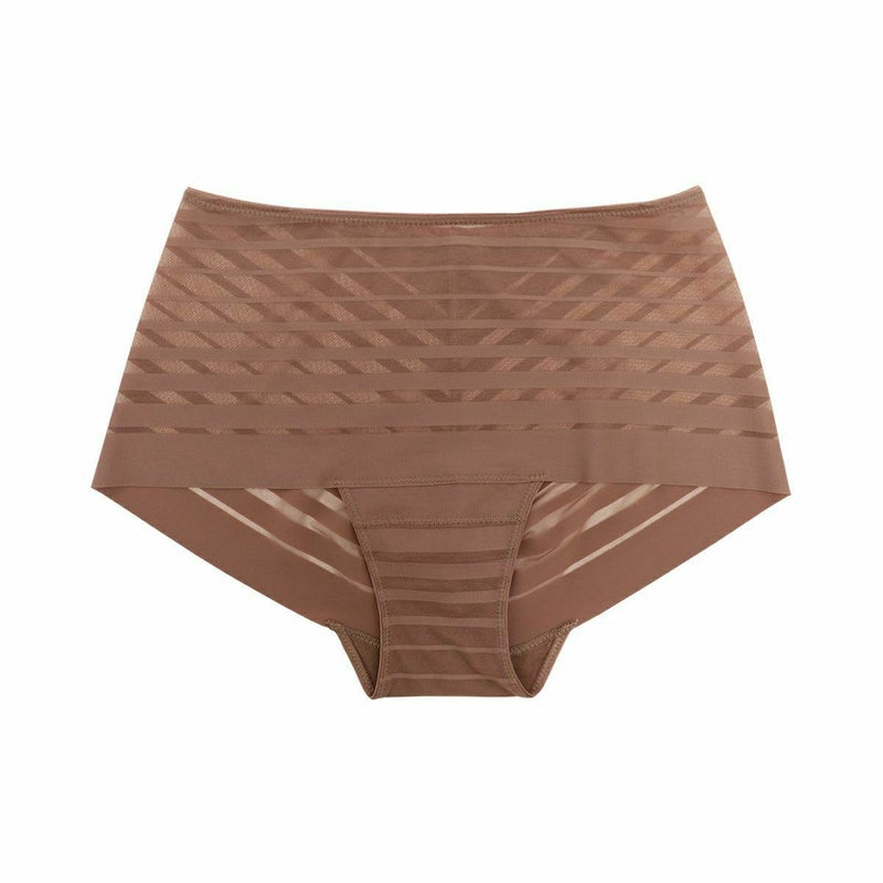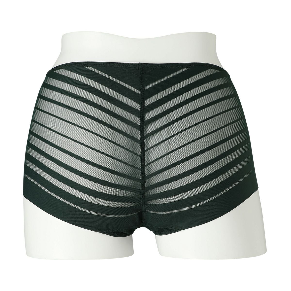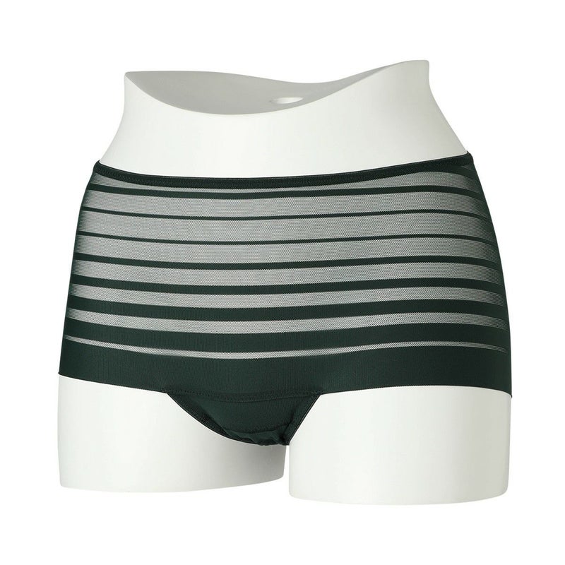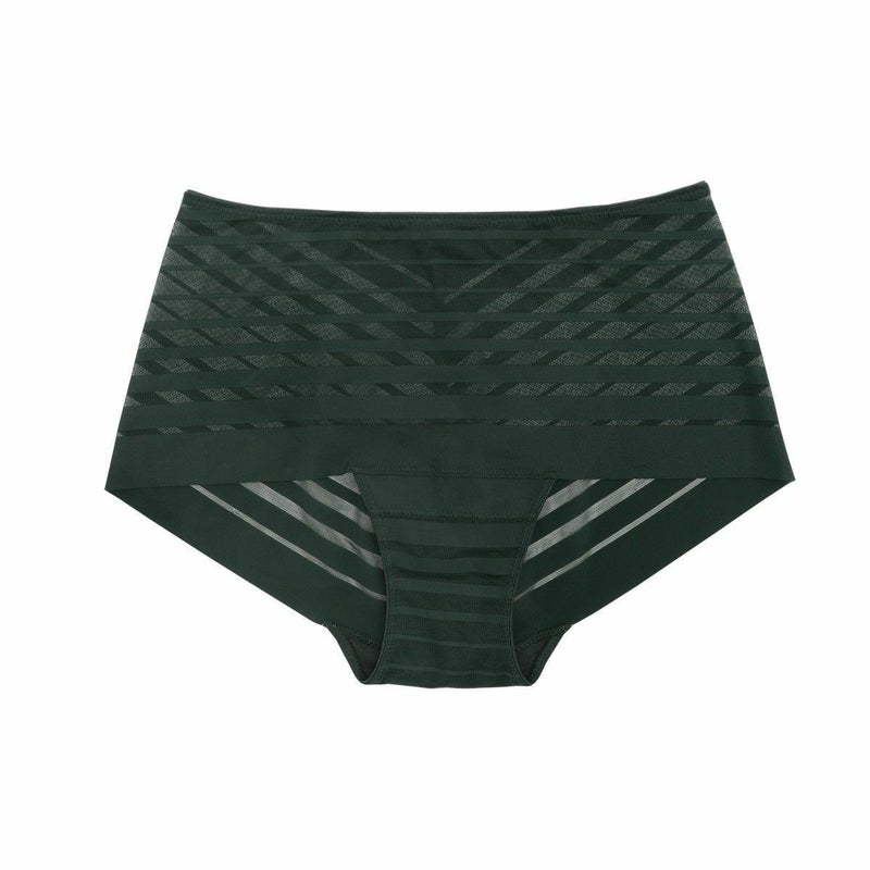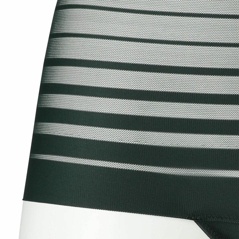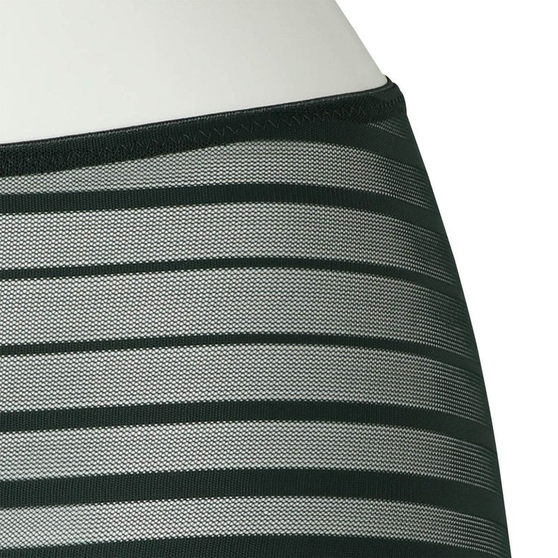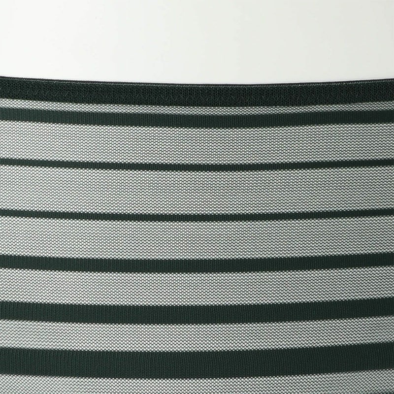 ルーチョ・フォンタナの作品にインスパイアされたコレクション。 - キャンバスを切り裂く- ボーダー柄のストレッチレースはエッジのフラットさを活かし軽やかに仕立てた。 前~後身頃が一続きで脇に縫い目の無いヒップハングショーツ。 足口ゴム無しでアウターにラインが響かず、レースから覗く肌もスタイリッシュな印象に。 マチ肌側は綿天竺使い。