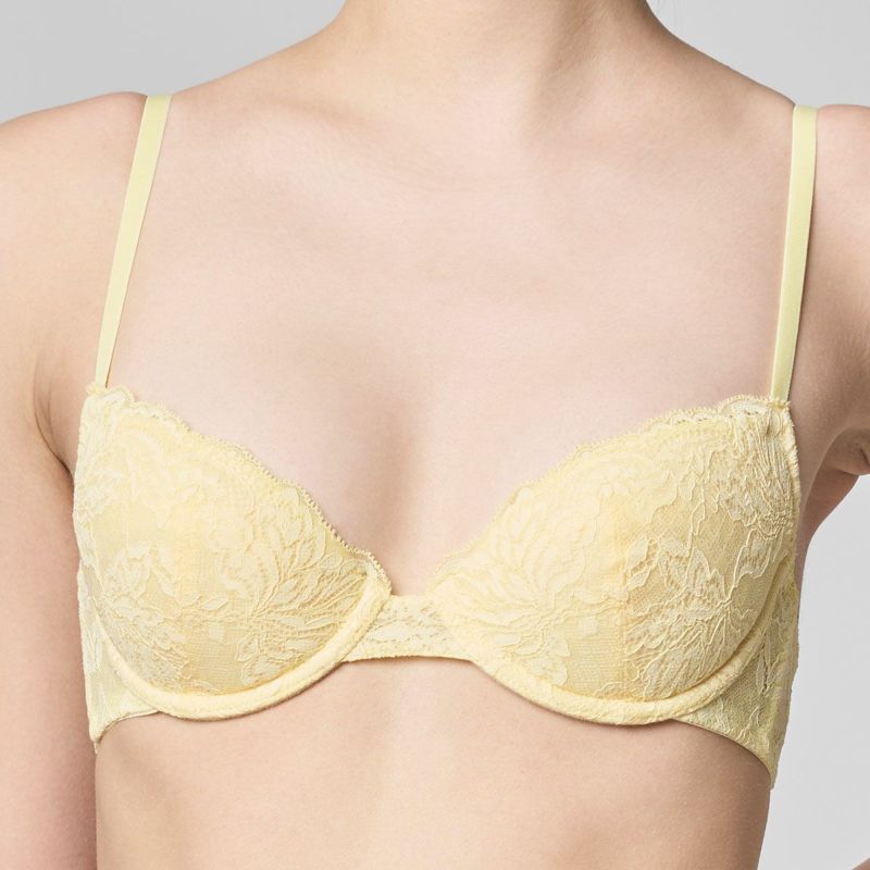 熱帯に咲く植物を描いたストレッチレース、まばゆい太陽の光を含んだような色彩。 ブラジルの陽気なカリオカのストーリー。 全面レース使いのメガネ型の3/4カップブラ。 メガネ型はアンダー部分の肌への接地面積が小さく圧迫感を緩和し軽やかにボディフィットする。 カップ端のレーススカラが胸元を縁取り、サイドにボーンを配しシルエットをスッキリと見せる。 カップ肌側、ストラップ内側がコットンで肌あたり優しい。