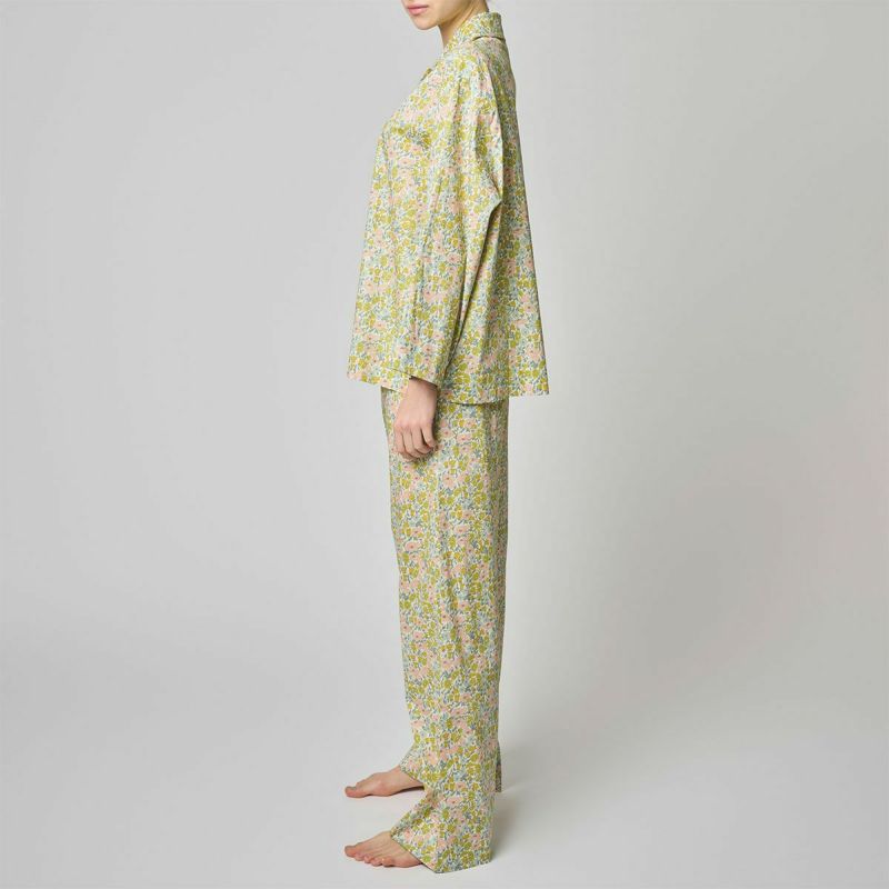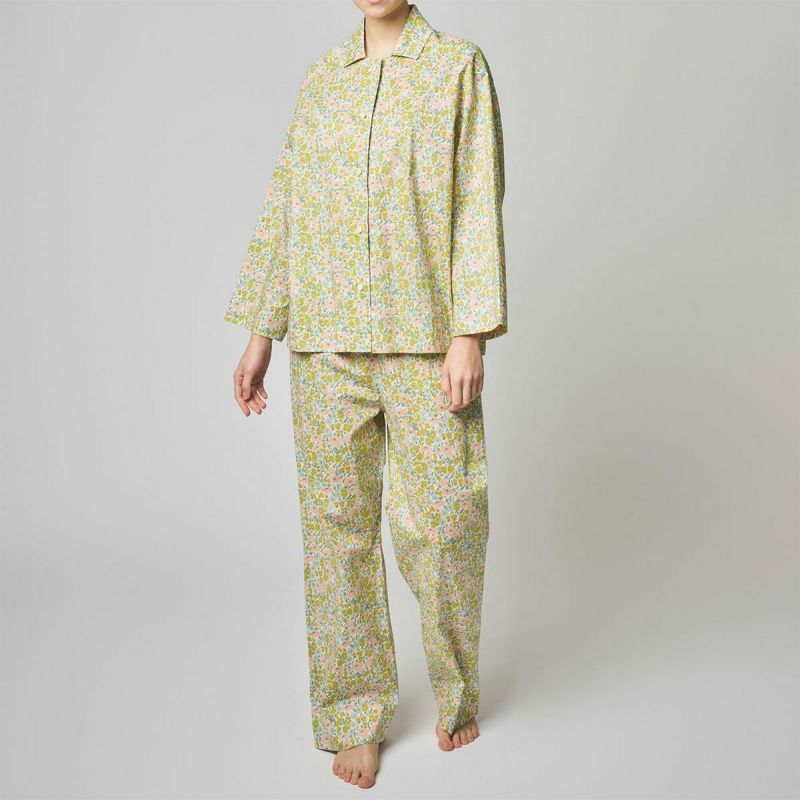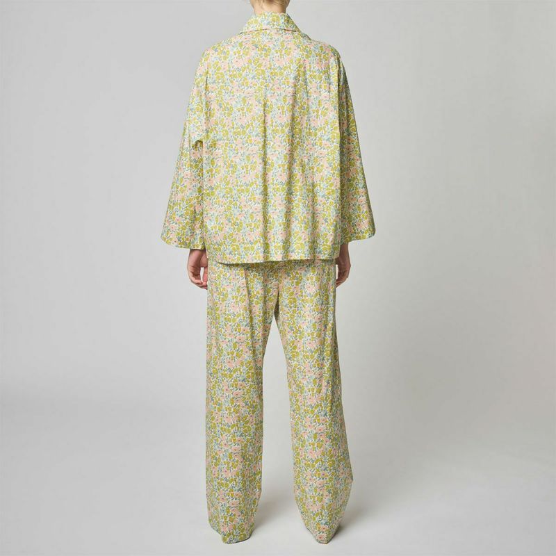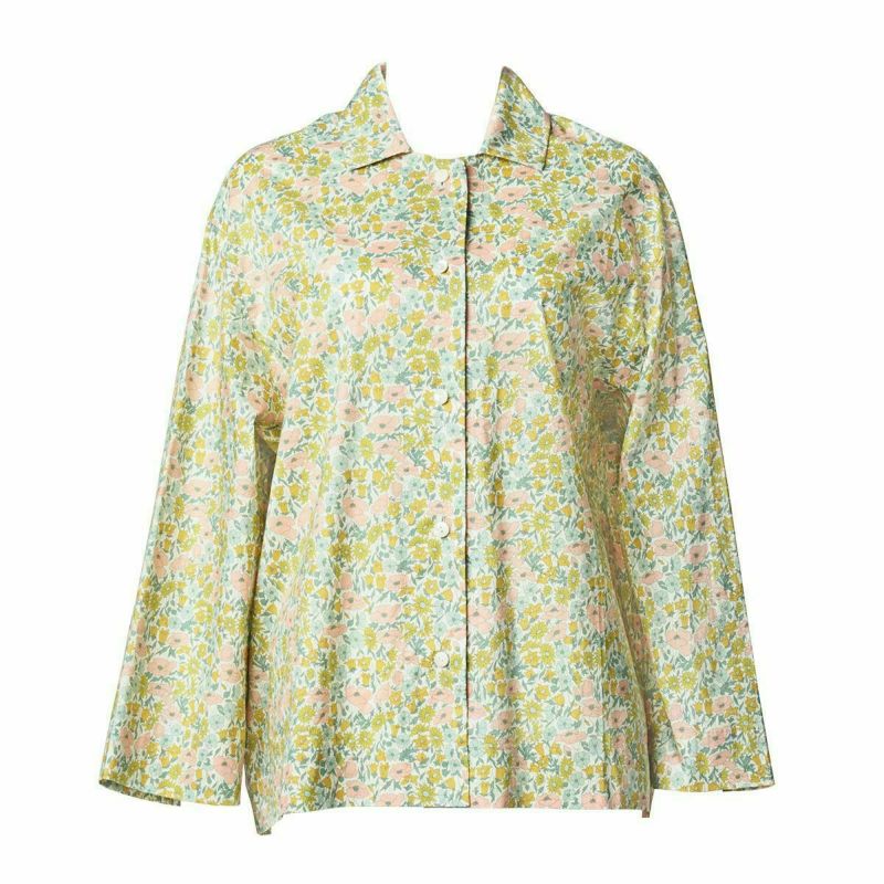 ブラジルの陽気なカリオカのストーリー。 カプリチョーザのランジェリーと調和するプリント、カラーをセレクト。 リバティの定番カラーのハーブイエロー&オリジナルカラーのライトグレーの2色展開。 左右の襟の間に抜け感を持たせたボックスシルエットのシャツトップス 貝釦の艶がアクセントに。 極細糸で緻密に織られた滑らかな肌当りのタナローンの着心地も魅力。