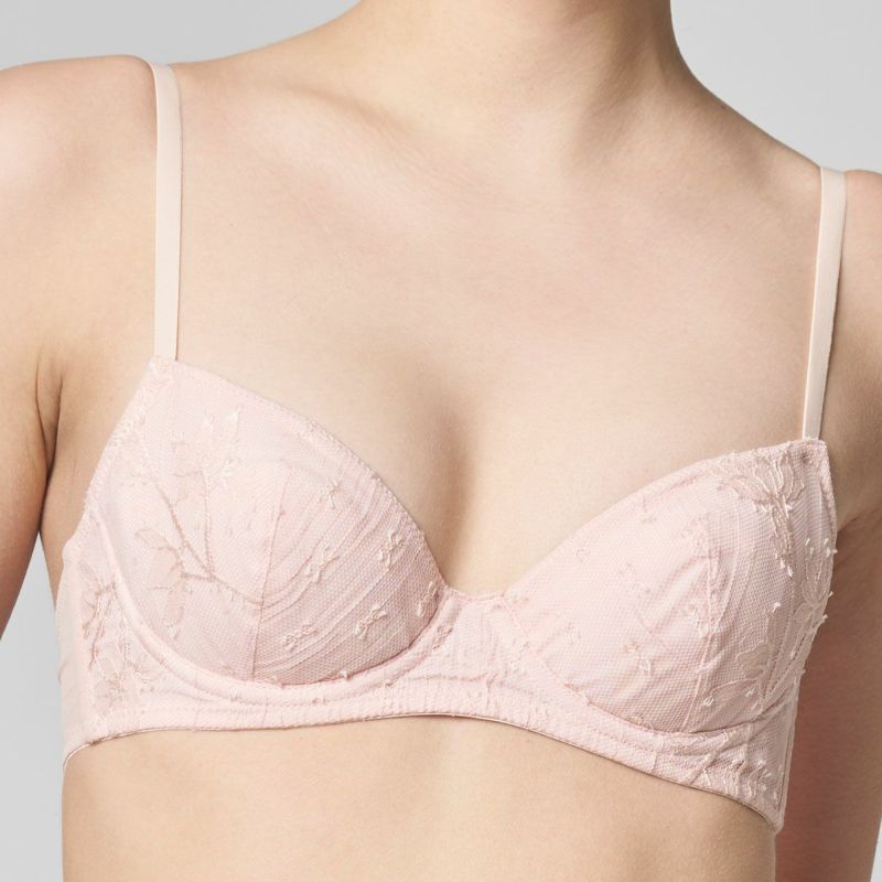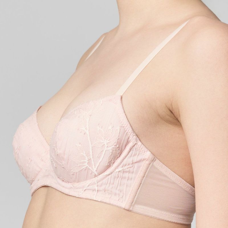 フロント・カップ部分はプリーツ布地にレースを重ね、素材それぞれの魅力を引き立てる。