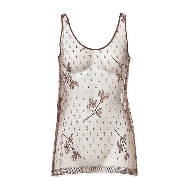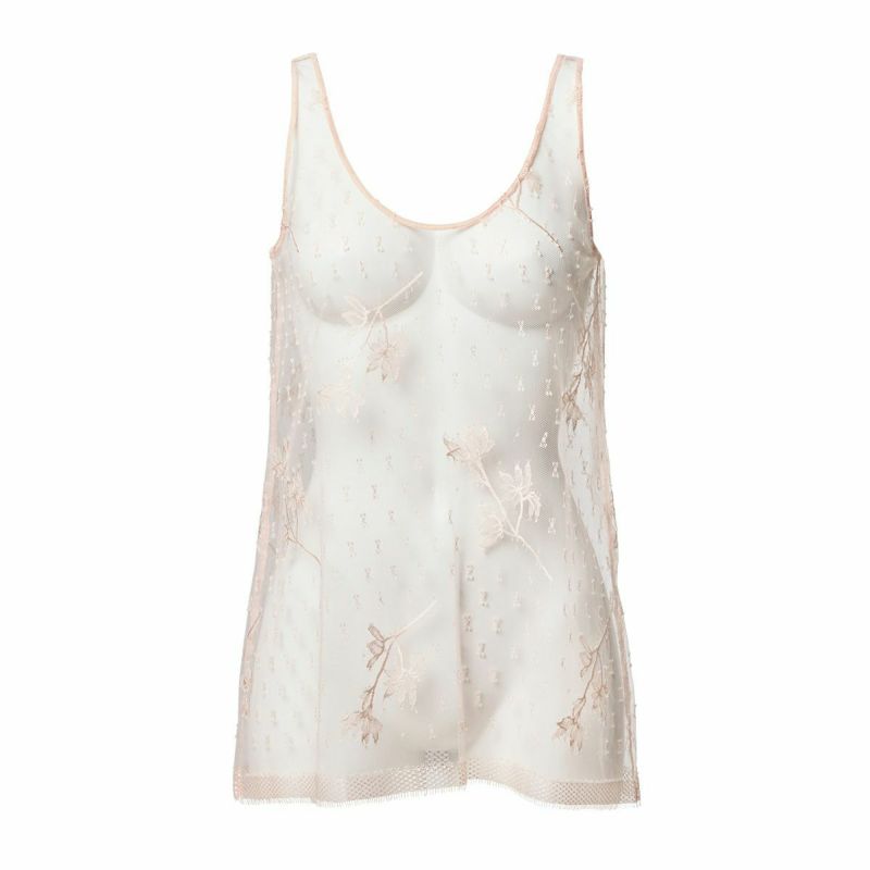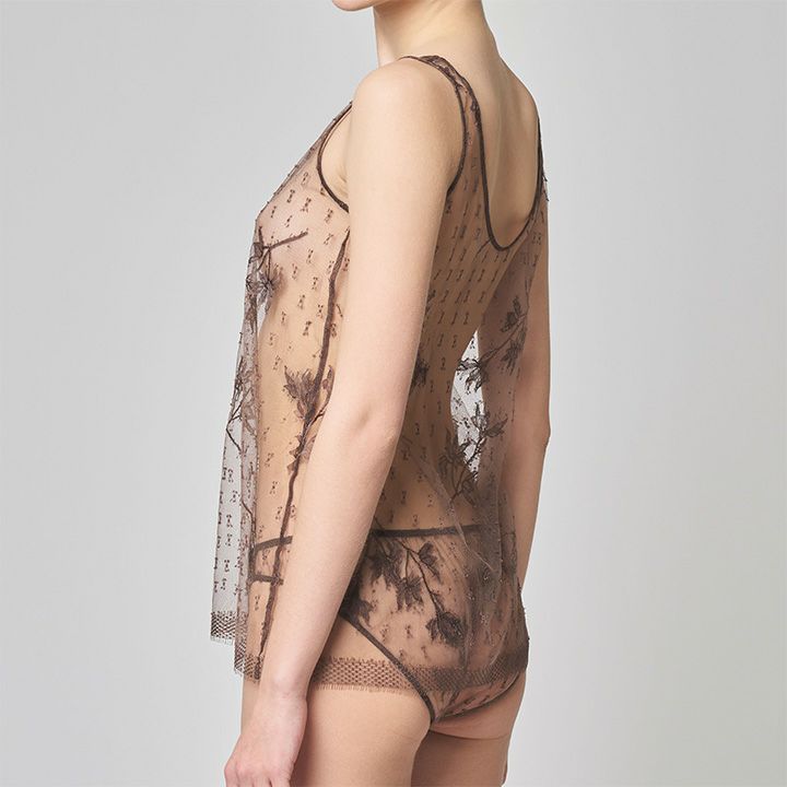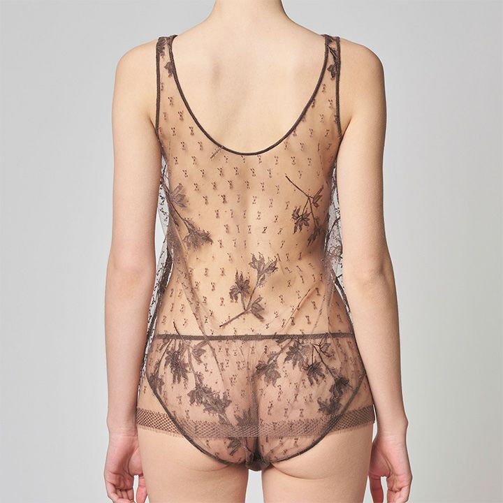 軽やかなドットにそっと花を添えたオリジナル柄のリバーレース。 不揃いにプリーツを施した布地とのコンビネーション。 全面リバーレース使いのタンクトップ型キャミソール。 裾にレースのストレートスカラを配し軽やかに仕立てた。 肌に映るレースの陰影も美しい。