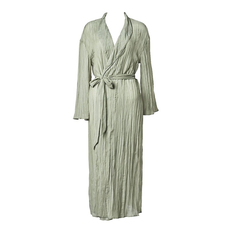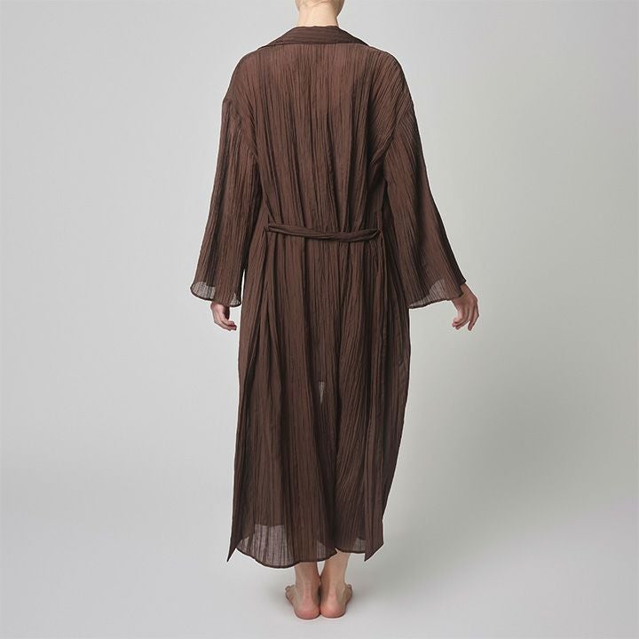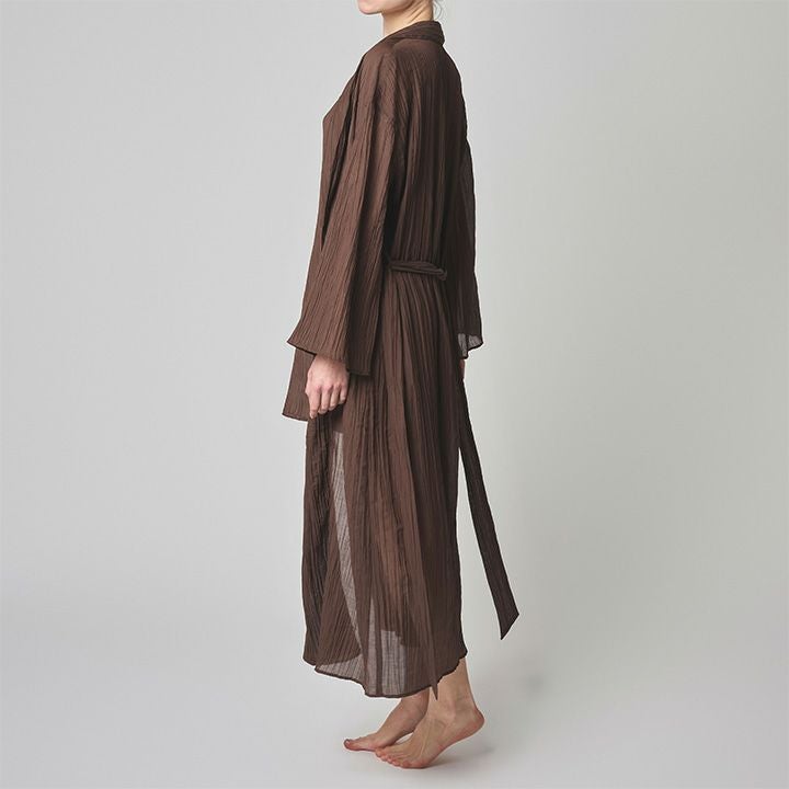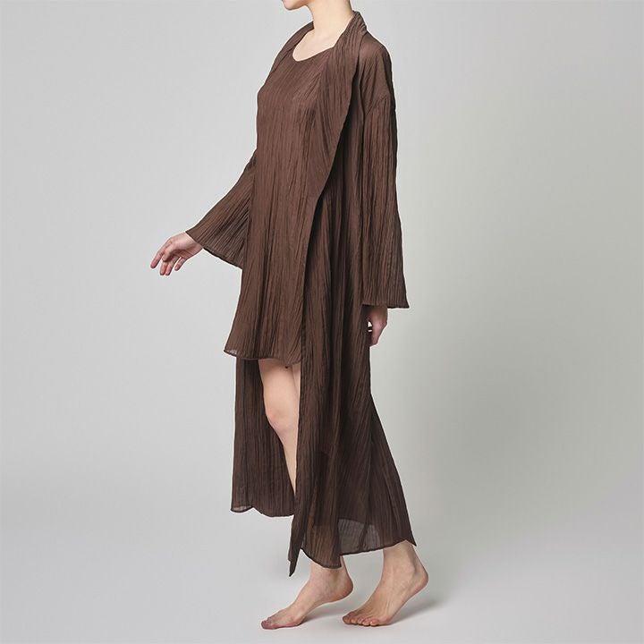 不揃いにプリーツを施した布地はナチュラルなムードを醸す。 軽やかな素材を活かしたリラックスアイテム。 ヘチマカラーのガウン。見頃・袖口共にやや裾広がりのAラインシルエット。 サイドポケット・共布のベルト付き。 ベルトでウエストをマークしてもベルトをせずにラフに着用しても様になる。 軽量でシワも目立たず、旅先等でも用途を問わず使えるアイテム。