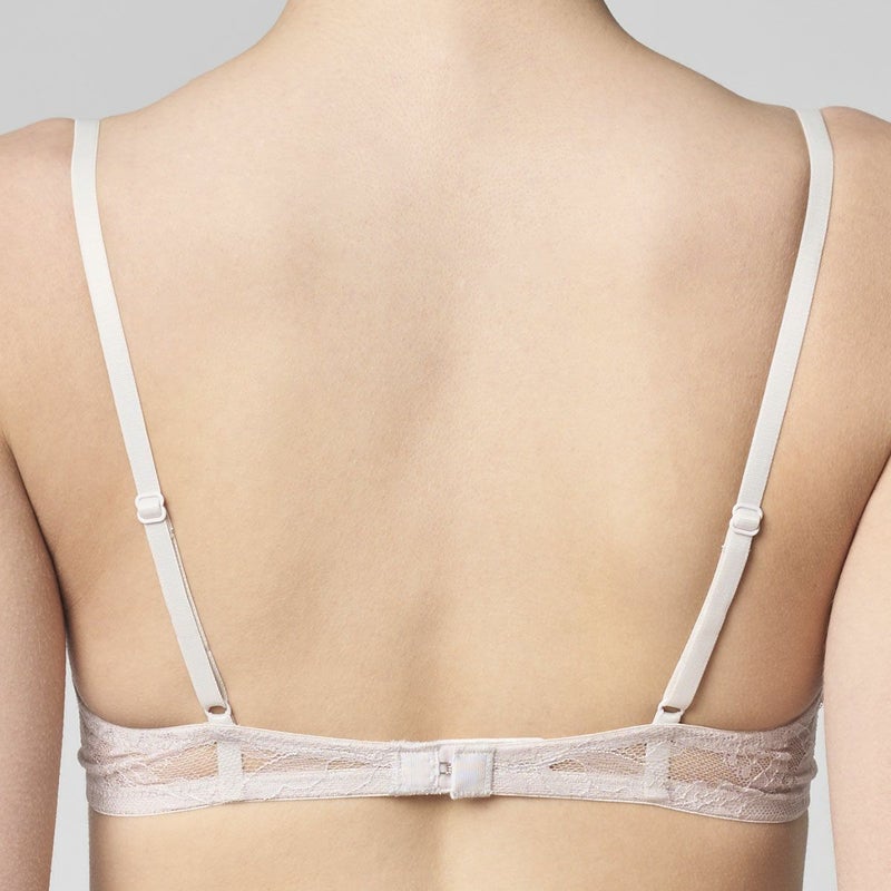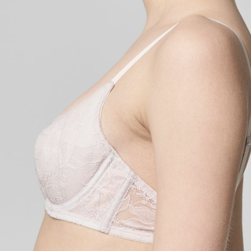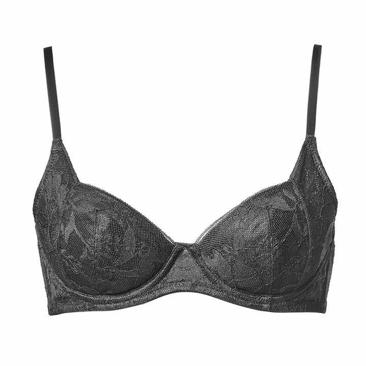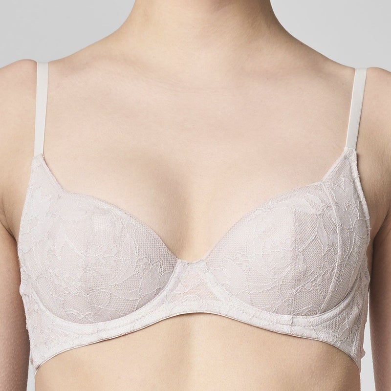 植物をおおらか描いたオリジナルのストレッチリバーレース。 綿100%天竺は 極細糸特有の艶やかさ。 全面リバーレースの3/4カップブラ。バックスタイルのレースが肌を印象的に彩る。 カップのサイドを肩先へ立ち上げ胸を中心側へ包み込むモデル。 カップ肌側は上質な綿天竺で肌当り滑らか。ストラップも肌側が綿素材。