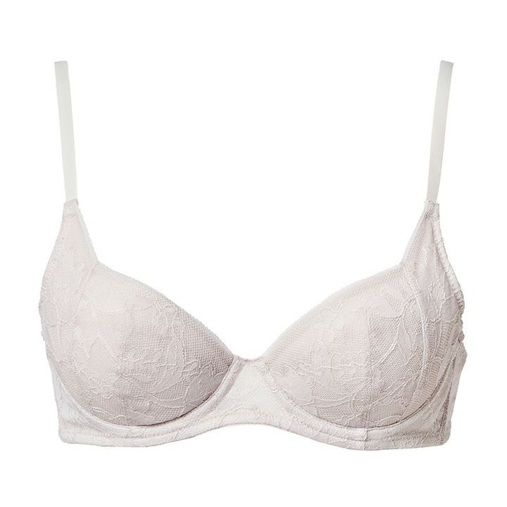 植物をおおらか描いたオリジナルのストレッチリバーレース。 綿100%天竺は 極細糸特有の艶やかさ。 全面リバーレースの3/4カップブラ。バックスタイルのレースが肌を印象的に彩る。 カップのサイドを肩先へ立ち上げ胸を中心側へ包み込むモデル。 カップ肌側は上質な綿天竺で肌当り滑らか。ストラップも肌側が綿素材。