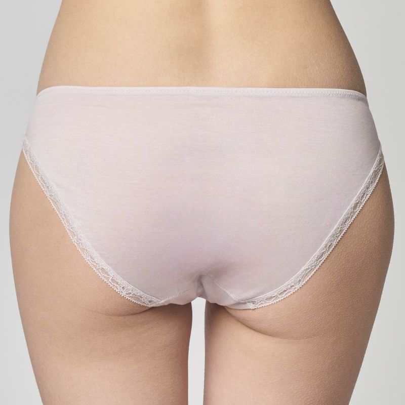 植物をおおらか描いたオリジナルのストレッチリバーレース。 綿100%天竺は極細糸特有の艶やかさ。 フロントはレース肌側に綿天竺を重ねて肌透けしない仕様。 前足くり~ 脇はレース一枚仕立てで鼠径部に負荷が無く軽やかな着用感。 ヒップは全面綿天竺、足口は細幅レースでフラットに仕立てた。 マチ端のゴムも表裏の内部に配して肌あたり滑らか。細部までこだわり着心地の良さを追求したスタンダードショーツ。
