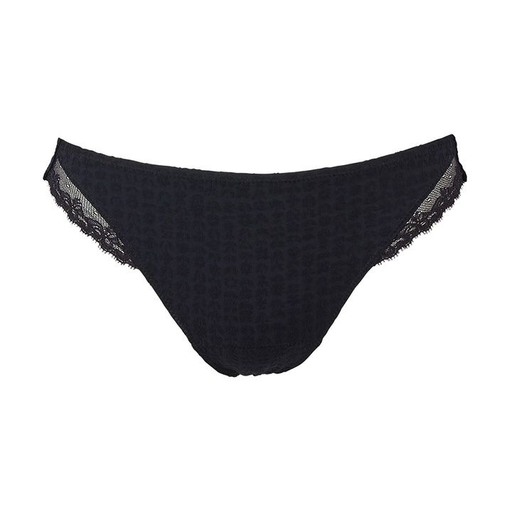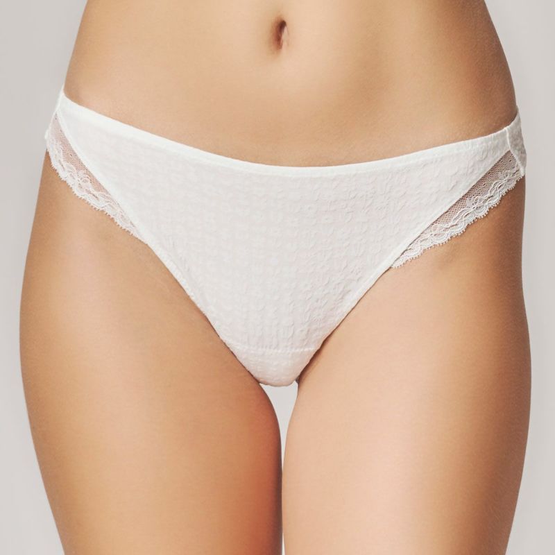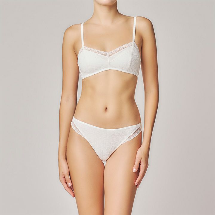 チャーミングなリボン柄を描いたフランス製のストレッチリバーレース。 立体的な花柄のストレッチジャガード織物はイタリア製。 ヨーロッパの職人技が奏でる素材の重なりが洗練されたムードを醸す。 ストレッチの効いたジャガード織物がしなやかにボディフィットするタンガ。 前脇にさりげなくレースを配した。覗く肌の透け感が軽さをプラス。
