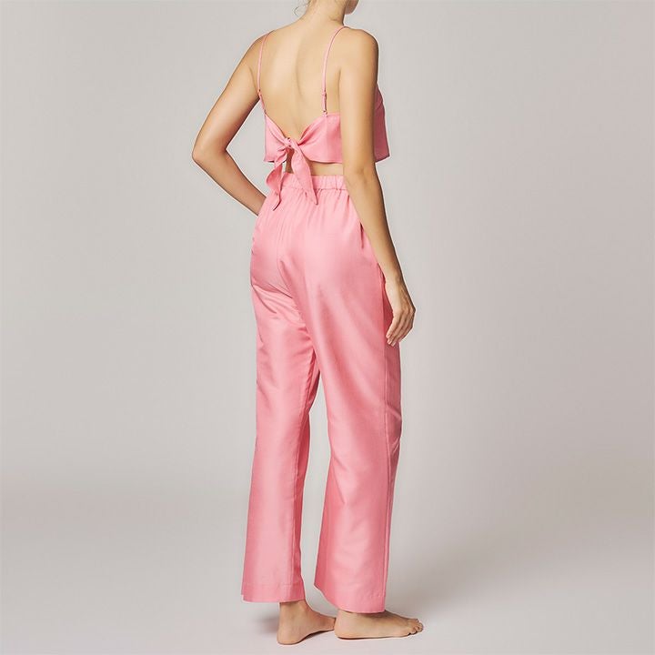 シルクコットンツイル布地の織りの特徴を生かし、表側に艶やかなシルク面・肌側にコットン面を使用。 天然素材の上質なリラックスアイテムも、スタイリング次第でパーティ仕様にも様変わりするウエア。 後中心で結べるリボンのディテールが大人のチャーミングさを演出するキャミソール。 リボンの結び目を調整し重ね着コーディネートなど、好みの着用感を楽しめる仕様。 ストラップ長調整可能。