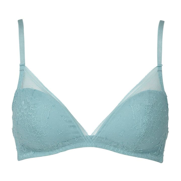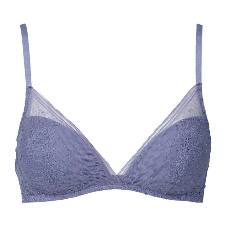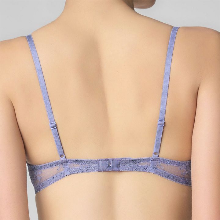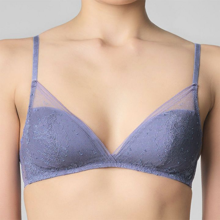初々しいブルーベルの花を描いたオリジナルのストレッチリバーレース。 軽快な装飾のストレートスカラ・ライトグレイッシュなカラーリングがレースの優美さを引き立てる。 ノンワイヤーながら安定した着用感でバストメイクしてくれる定評のモデル。 バックスタイルまで全面リバーレースで見た目にも軽やか。 綿混のストラップ、カップ肌側の綿天竺の肌当たりの優しさも魅力。