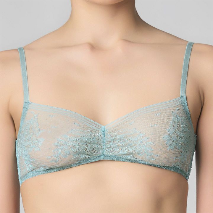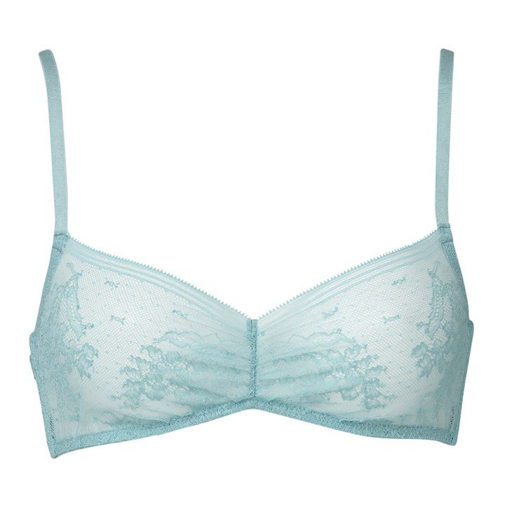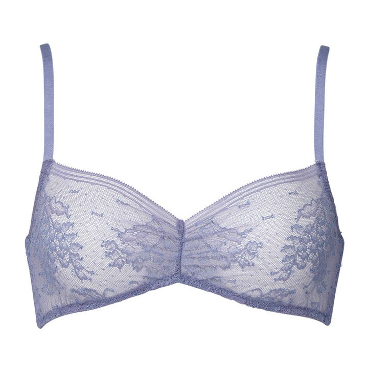 初々しいブルーベルの花を描いたオリジナルのストレッチリバーレース。 軽快な装飾のストレートスカラ・ライトグレイッシュなカラーリングがレースの優美さを引き立てる。 全面リバーレースのノンワイヤー・ノンパテッドブラ。カップは前中心ギャザー仕立て。 脇にボーンを配し着用時シルエットをスッキリと見せる。