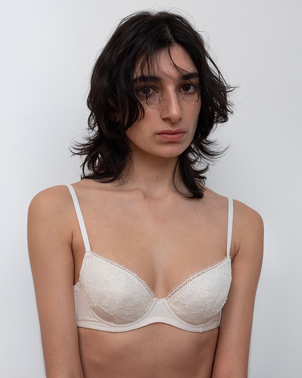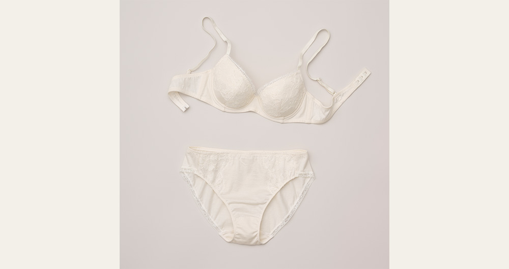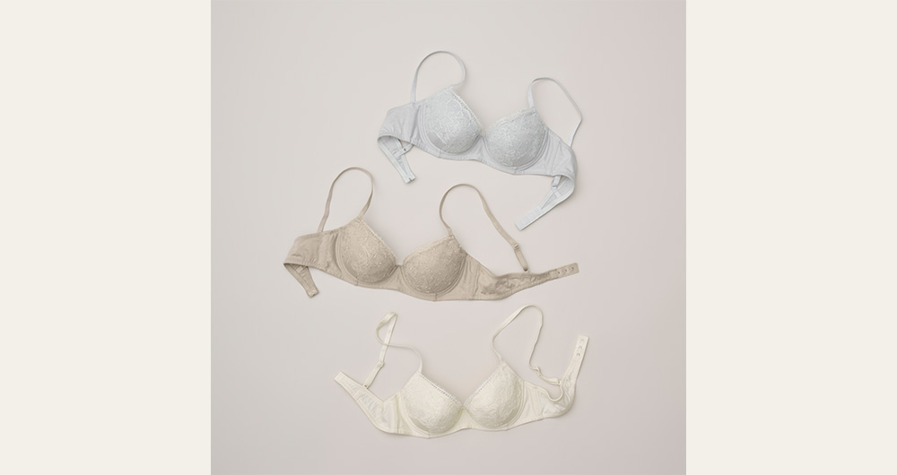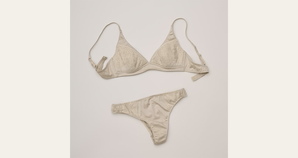 過去のコレクションで使用したフレンチリネン混の残レースを使用したブラジャーも加えたラインナップ。